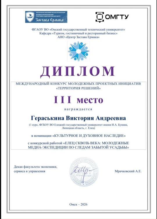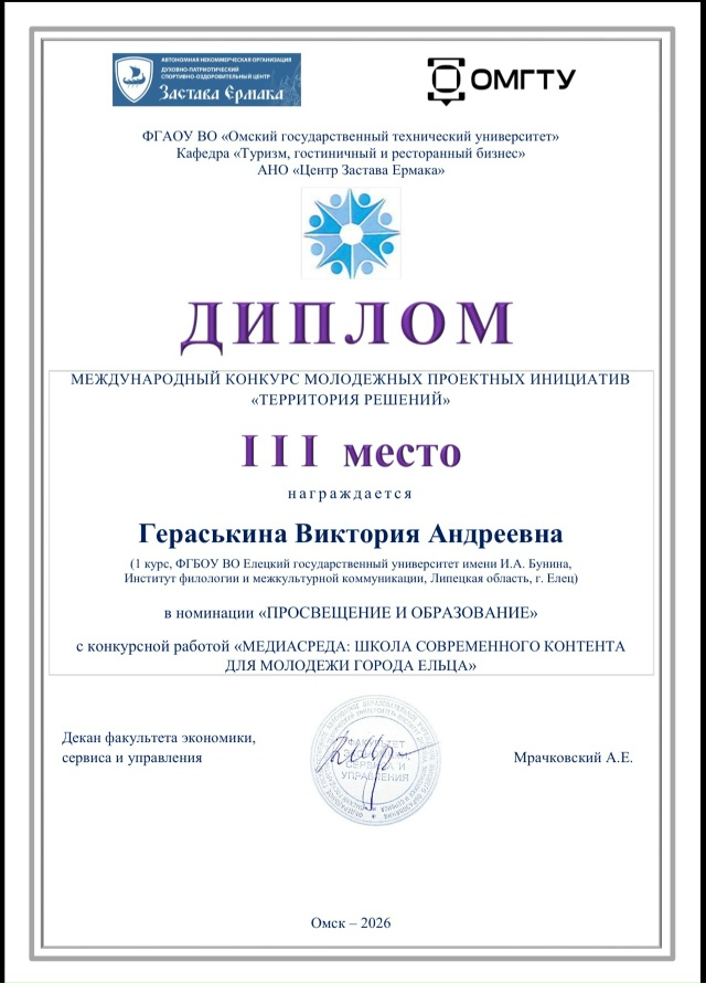 «Елец сквозь века: молодежные медиа-экспедиции по следам забытой усадьбы»в номинации «Просвещение и образование» с проектом «Медиасреда: школа современного контента для молодежи города Ельца».