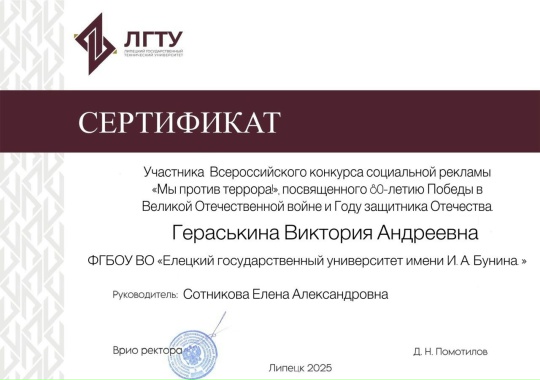 Гераськина Виктория Андреевна (ПЖ-11) приняла участие во Всероссийском конкурсе социальной рекламы «Мы против террора», посвящённом 80-летию Победы в Великой Отечественной войне и Году защитника Отечества, и была награждена сертификатом участника.