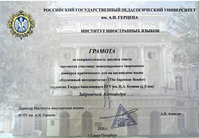 Подведены итоги международного конкурса «Вдумчивый интерпретатор» (Ingenious Reader) –2026. Конкурс был проведён Институтом иностранных языков Российского государственного педагогического университета им. А. И. Герцена (г. Санкт-Петербург).