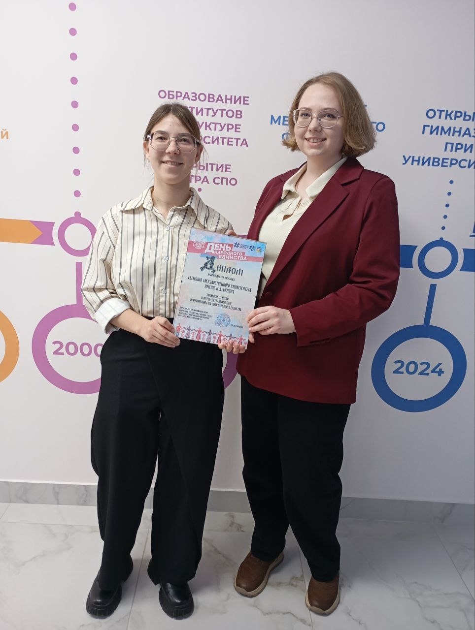 В преддверии праздника команда ЕГУ им. И.А. Бунина, состоящая из студентов разных институтов, заняла первое место в интеллектуальном состязании. Институт филологии и межкультурной коммуникации представляли Валерия Гасратова и Елизавета Подлесных.