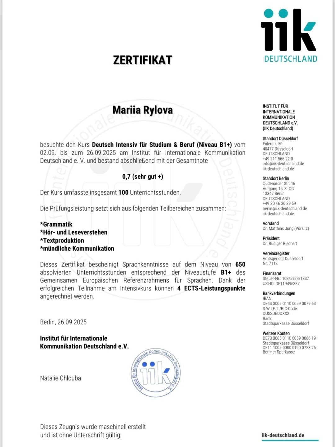 Студентка группы РИО-41 Мария Рылова успешно завершила языковые курсы в Institut für Internationale Kommunikation Deutschland в Берлине (Германия).