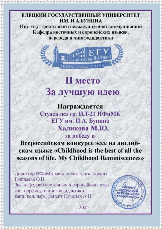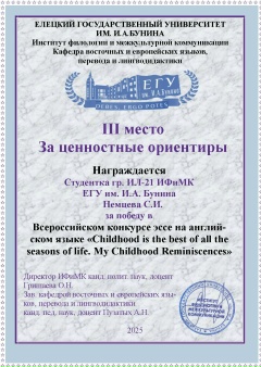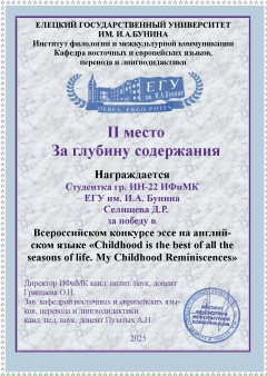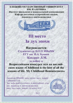 Поздравляем студентов 1-2 курса института филологии и межкультурной коммуникации, которые стали победителями Всероссийского конкурса эссе на английском языке «Childhood is the best of all the seasons of life. My Childhood Reminiscences», приуроченного к Десятилетию детства 2018-2027 гг.