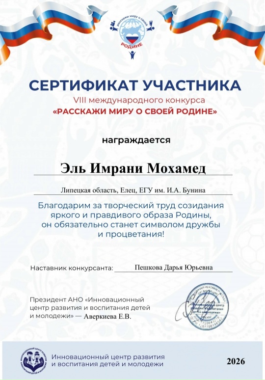 Слушатель подготовительного отделения по дополнительной образовательной общеразвивающей программе "Адаптация образования иностранных граждан к требованиям российских стандартов" Эль Имрани Мохамед принял участие в VIII международном конкурсе "Расскажи миру о своей Родине". В своей работе Мохамед рассказал о своей родине Марокко и об учебе в ИФиМК ЕГУ им. И. А. Бунина.
