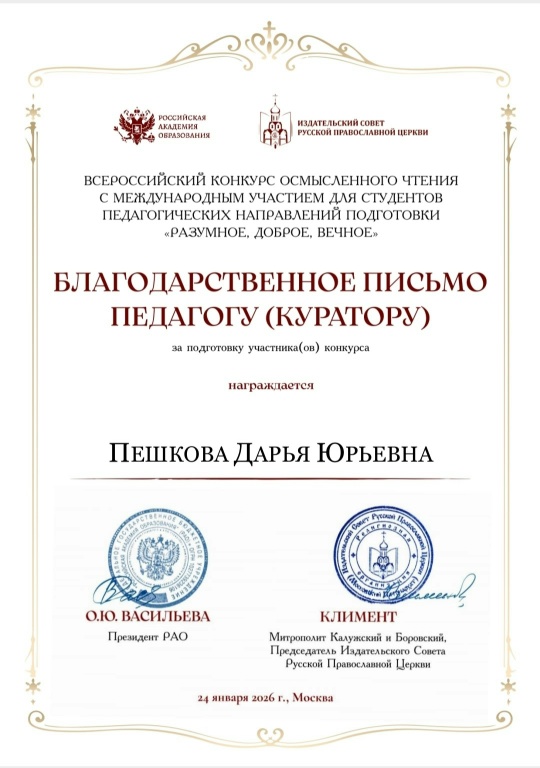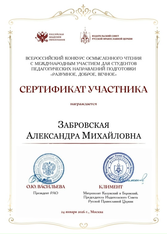 Студентка 2 курса группы ИН-22 Александра Забровская приняла участие во Всероссийском конкурсе осмысленного чтения с международным участием "Разумное, доброе, вечное" для студентов педагогических направлений подготовки. Организаторы - РАО при поддержке Издательского совета Русской Православной Церкви.