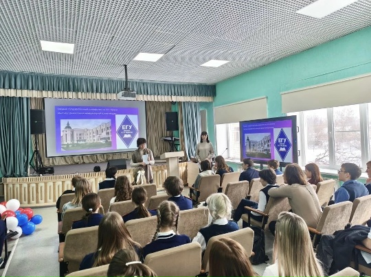 Сотрудники кафедры русской филологии и журналистики Иванова М.Ю. и Зайцева Н.В. представили школьникам широкие карьерные перспективы, открывающиеся после получения высшего образования на филологическом и журналистском направлениях.